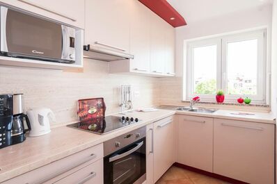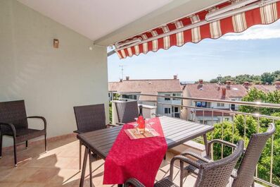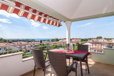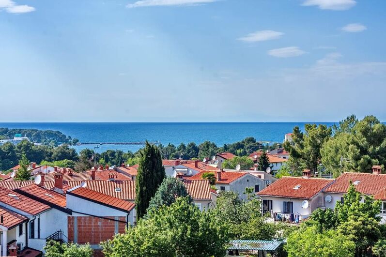 Die im zweiten Obergeschoß als Penthousewohnung gelegene Ferienwohnung mit einem 270 Grad Rundumblick auf die Plava Laguna ( blaue Lagune ), auf die Adria Richtung Venedig sowie auf die italienischen und slowenischen Alpen bewohnen Sie mit bis zu 5 Personen. Gäste bezeichnen diese Ferienwohnung auch als Präsidentensuite. Der Standort in einer gesellschaftlich beliebten Wohnlage von Porec wird Sie begeistern.