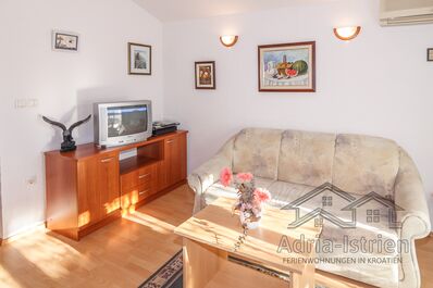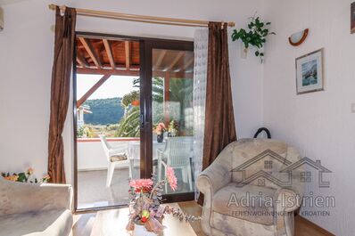 Schon fast ein kleines separates Häuschen in Swimmingpool-Villa Kampora mit einer Aufteilung für die Ferienwohnung bestehend aus Elternschlafzimmer mit zusätzlichem Beistellbett, Wohnbereich mit Schlafcouch, Küche, Bad, Balkon/ Terrasse. Die Ferienwohnung eignet sich für 4 bis max. 5 Personen mit Kleinkind.