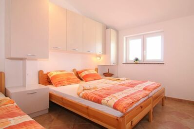 Das Elternschlafzimmer ( 2 x 90 x 200 cm ) hat einen direkten Badzugang. Das Kinderzimmer ( 2 x 90 x 200 und 1 x 90 x 180 cm ) mit drei Betten hat ebenfalls ein separates Bad. Bedingt durch die eingebauten Kleiderschränke ist genügend Stauraum vorhanden.
